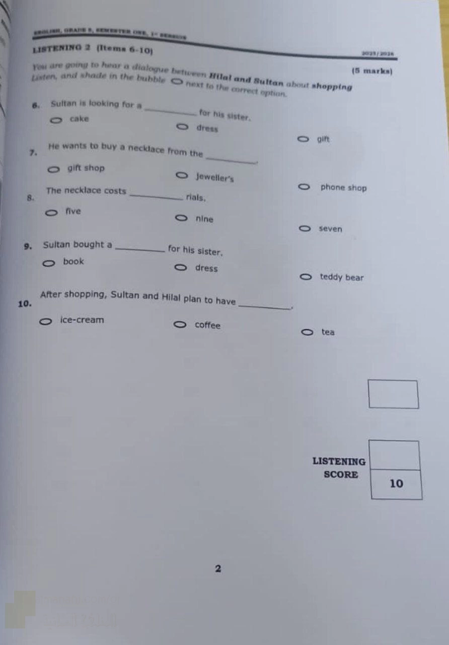 5. الصف السادس, لغة انجليزية, أسئلة الامتحان الرسمي النهائي الدور الأول الفترة الصباحية لمادة اللغة الإنجليزية