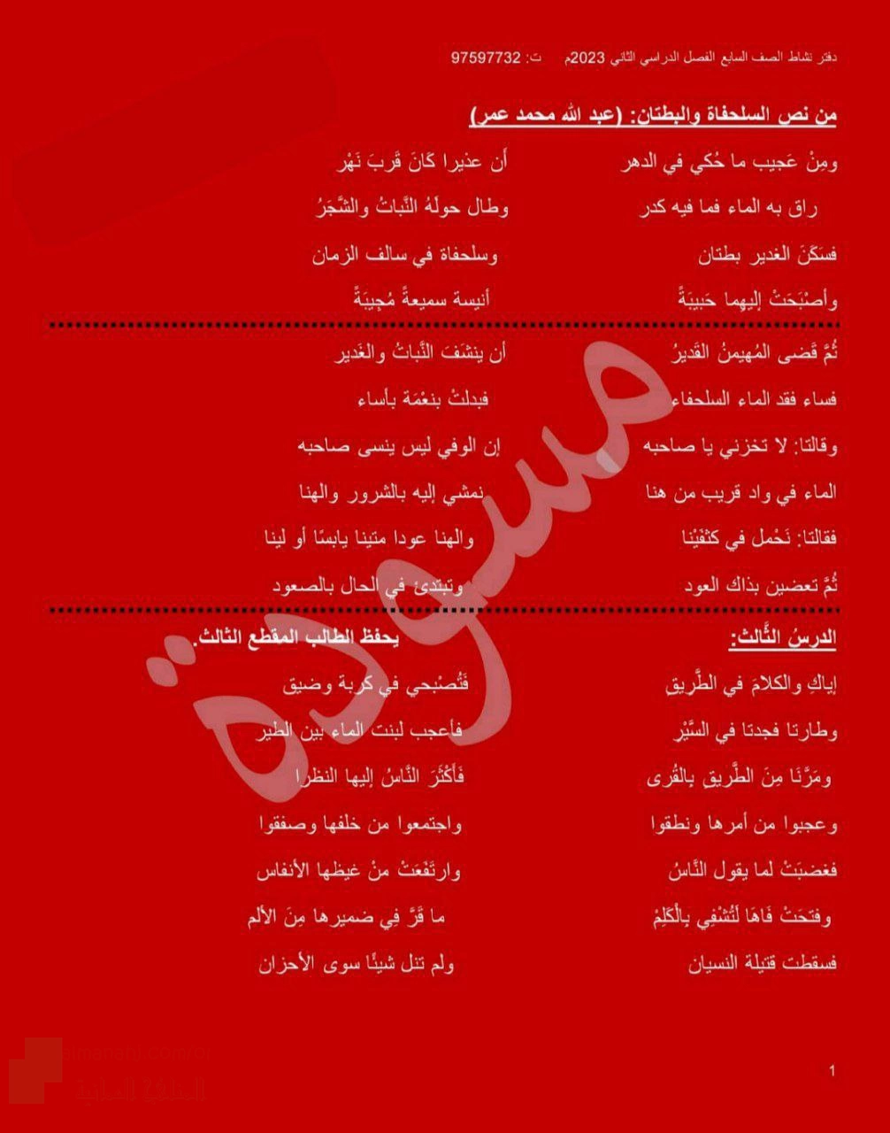 2. الصف السابع, لغة عربية, القصيدة الشعرية السلحفاة والبطتان العناصر والموضوعات والدلالات