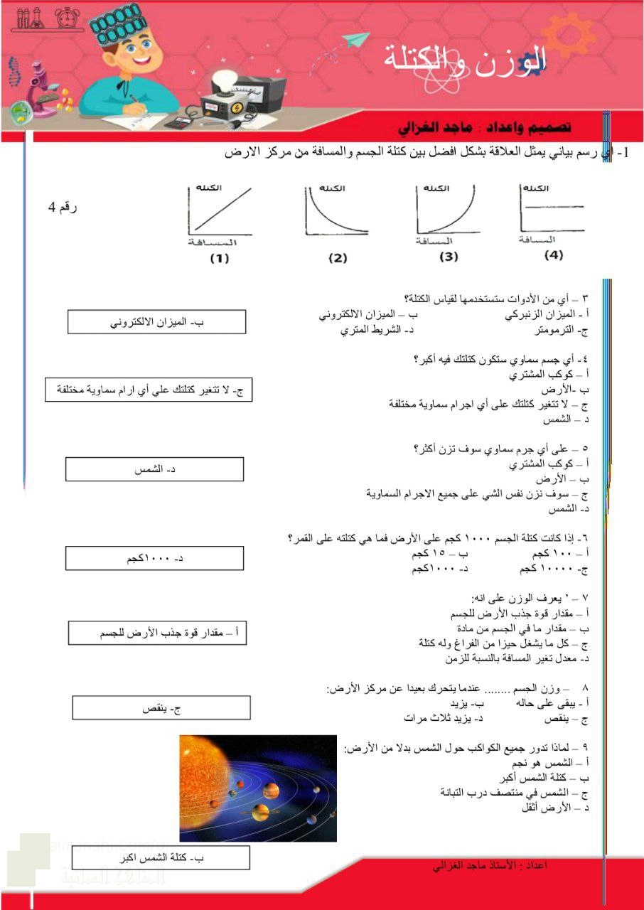 11. الصف السادس, علوم, تقييم الفهم العلمي لمفاهيم الكتلة والوزن عبر مجموعة شاملة من الأسئلة