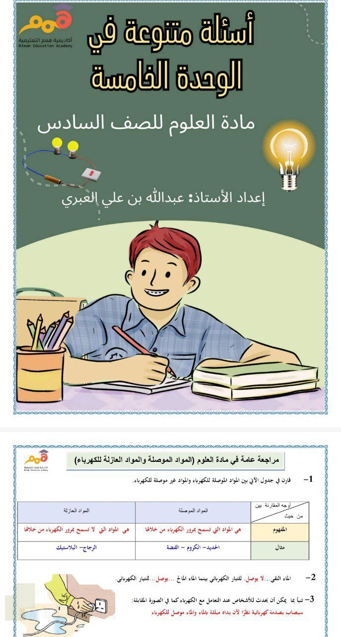 8. الصف السادس, علوم, مراجعة شاملة للمفاهيم والتطبيقات العملية في وحدة المواد الموصلة والعازلة للكهرباء