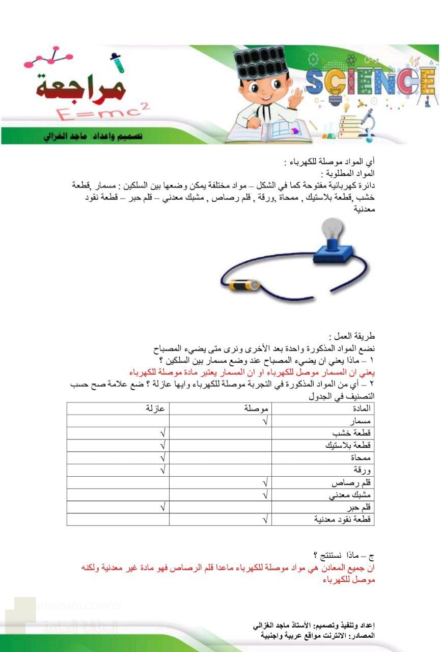 7. الصف السادس, علوم, مراجعة شاملة لمفاهيم المواد الموصلة والعازلة للكهرباء