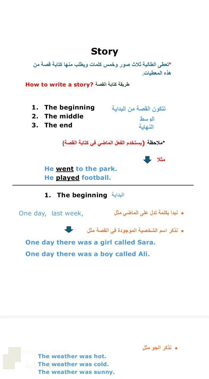 يركز الشرح على الهيكل الثلاثي للقصة: البداية (بدلالات زمنية مثل "One day" أو "Last week")، والوسط (باستخدام أدوات ترتيب الأحداث مثل "First" و "Next" و "After that")، والنهاية (بكلمة "Finally" مع التعبير عن المشاعر).