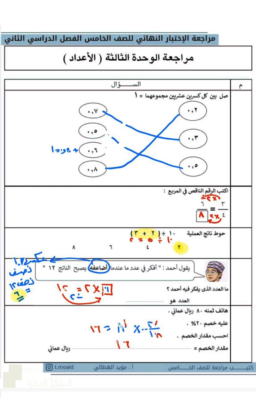 10. الصف الخامس, رياضيات, الوحدة الثالثة الأعداد ورقة مراجعة حول الكسور والنسب المئوية غير محلول