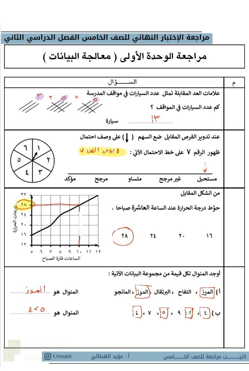 حلول الوحدة الأولى معالجة البيانات مراجعة التمثيل البياني والاحتمالات, مؤيد الهطالي, الصف الخامس, رياضيات, الفصل الثاني, 2025/2026 - المناهج العمانية