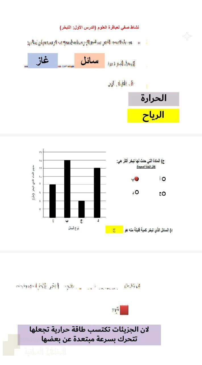 يتضمن تمارين حول التبخر، موضحًا أنه تحول السائل إلى غاز بامتصاص الحرارة، ويتأثر بعوامل كدرجة الحرارة والرياح والمساحة المعرضة.