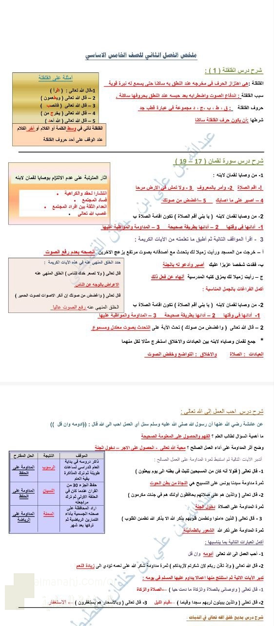 يغطي هذا الملف الدروس الأساسية في التربية الإسلامية، بدءًا من أحكام التجويد كالقلقلة الصغرى والكبرى، مرورًا بتفسير وصايا لقمان والمواعظ المستفادة من سور القرآن الكريم.