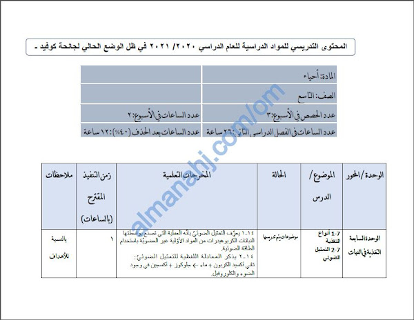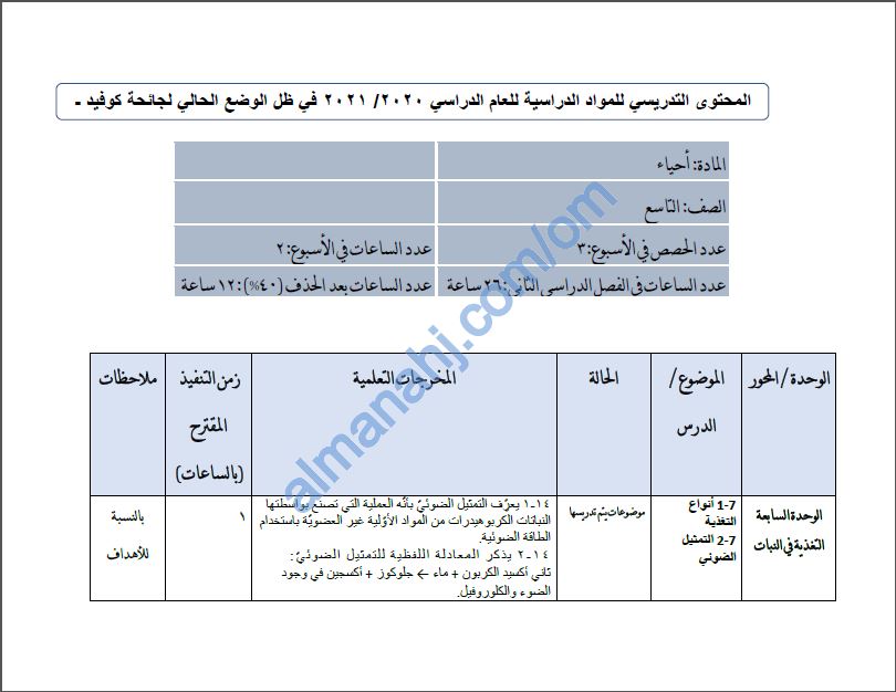 خطة المحتوى التدريسي (تحديث فبراير) لمدارس التعليم المباشر, الصف التاسع, أحياء, الفصل الثاني, 2021-2022, منهج انجليزي - المناهج العمانية