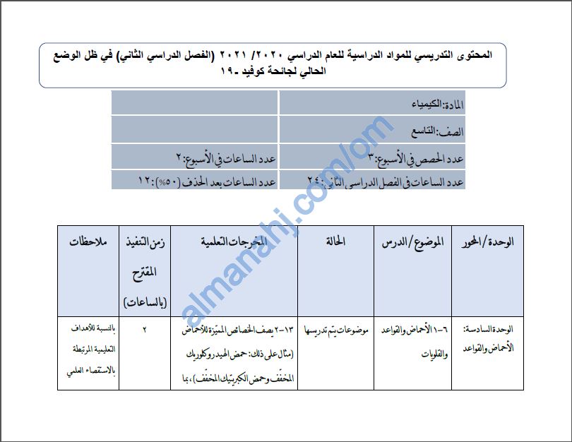 خطة المحتوى التدريسي (تحديث فبراير) لمدارس التعليم المباشر, الصف التاسع, كيمياء, الفصل الثاني, 2021-2022, منهج انجليزي - المناهج العمانية