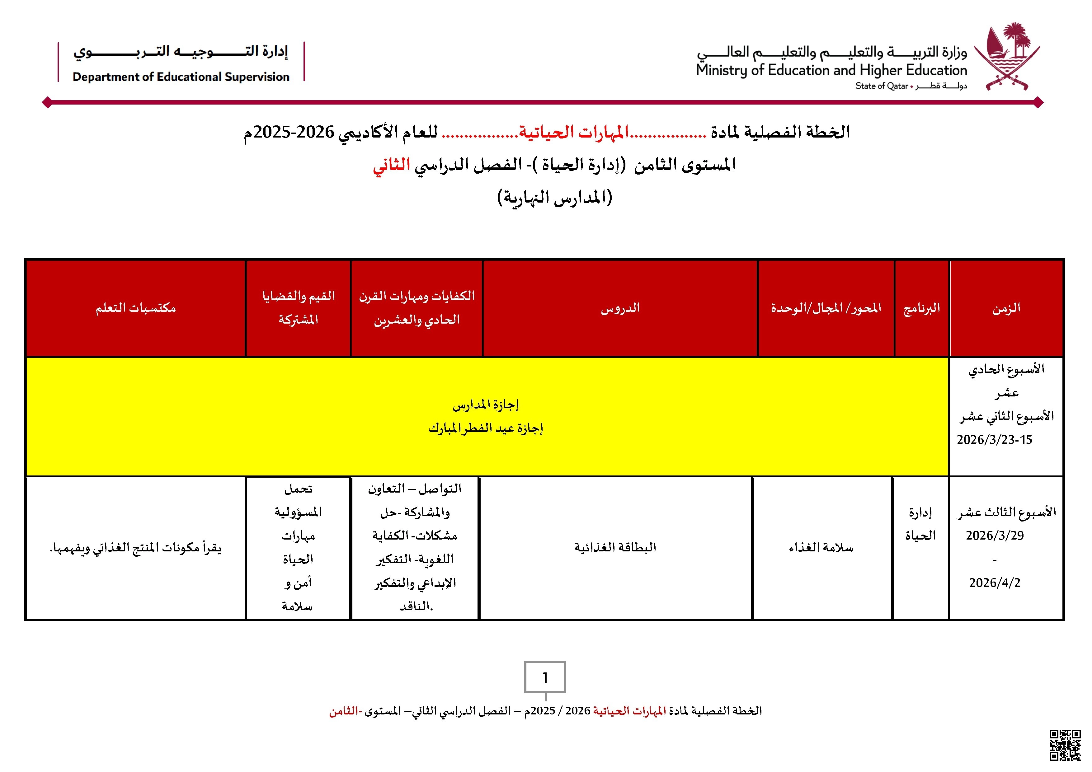 الخطة الفصلية المعدلة بنات للفصل الثاني اخر تحديث 9 أبريل