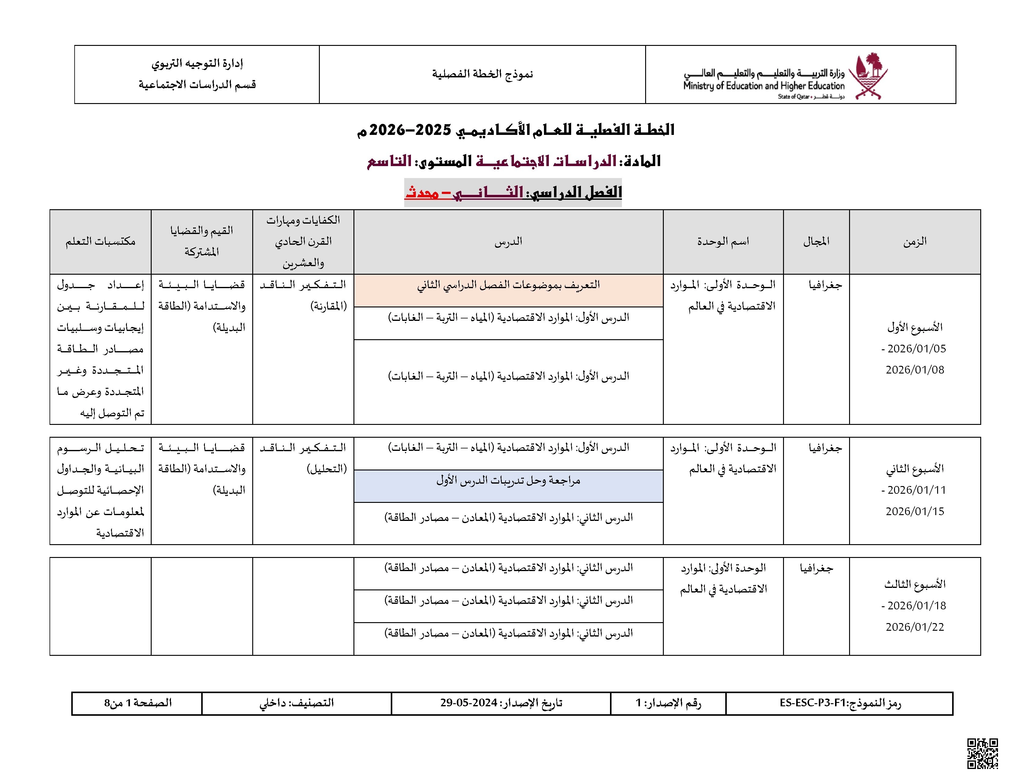 الخطة الفصلية المعدلة للفصل الثاني اخر تحديث 9 أبريل بحسب الصف التاسع في مادة الاجتماعيات – الفصل الثاني