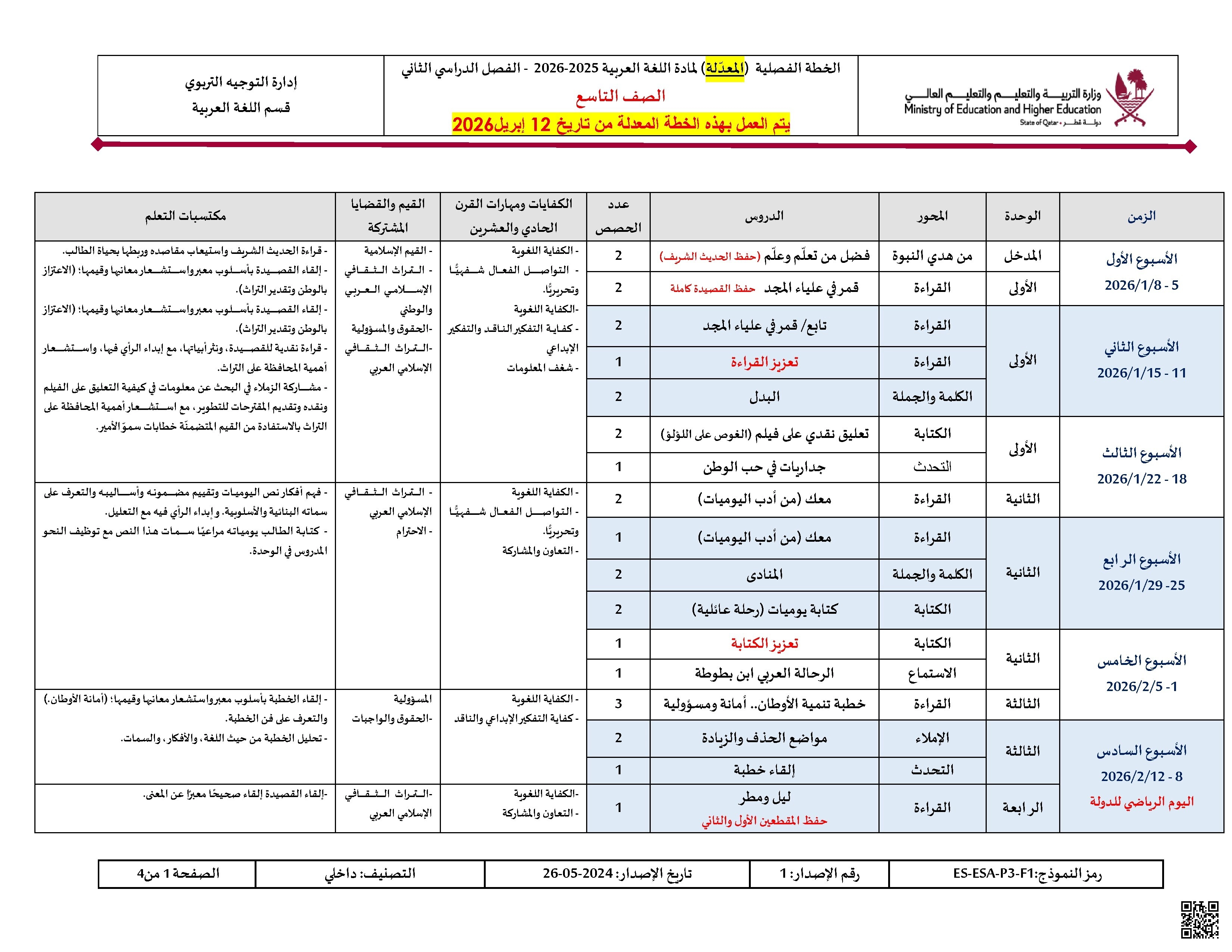 الخطة الفصلية المعدلة للفصل الثاني اخر تحديث 9 أبريل بحسب الصف التاسع في مادة اللغة العربية – الفصل الثاني