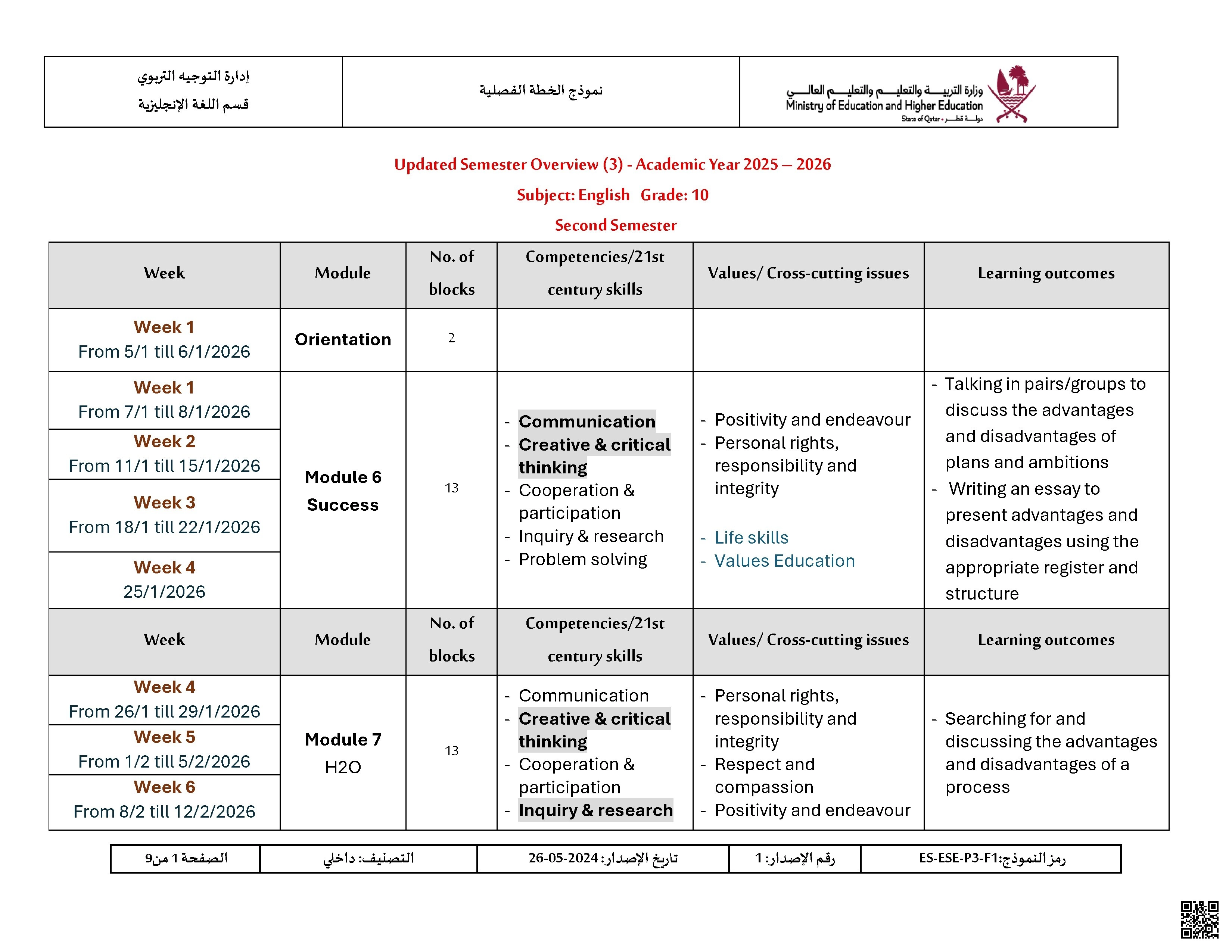 الخطة الفصلية المعدلة للفصل الثاني اخر تحديث 9 أبريل بحسب الصف العاشر في مادة اللغة الإنجليزية – الفصل الثاني