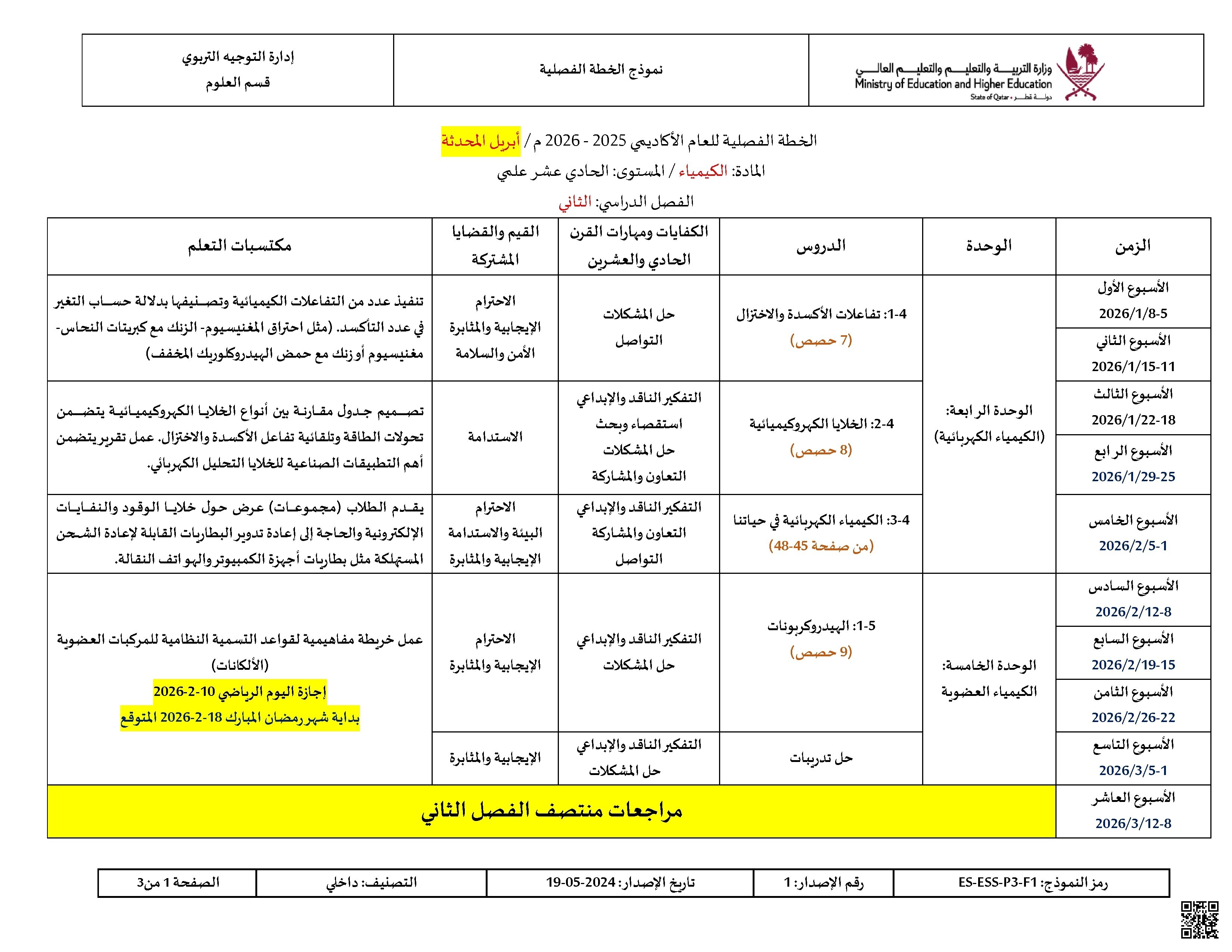الخطة الفصلية المعدلة للفصل الثاني اخر تحديث 9 أبريل