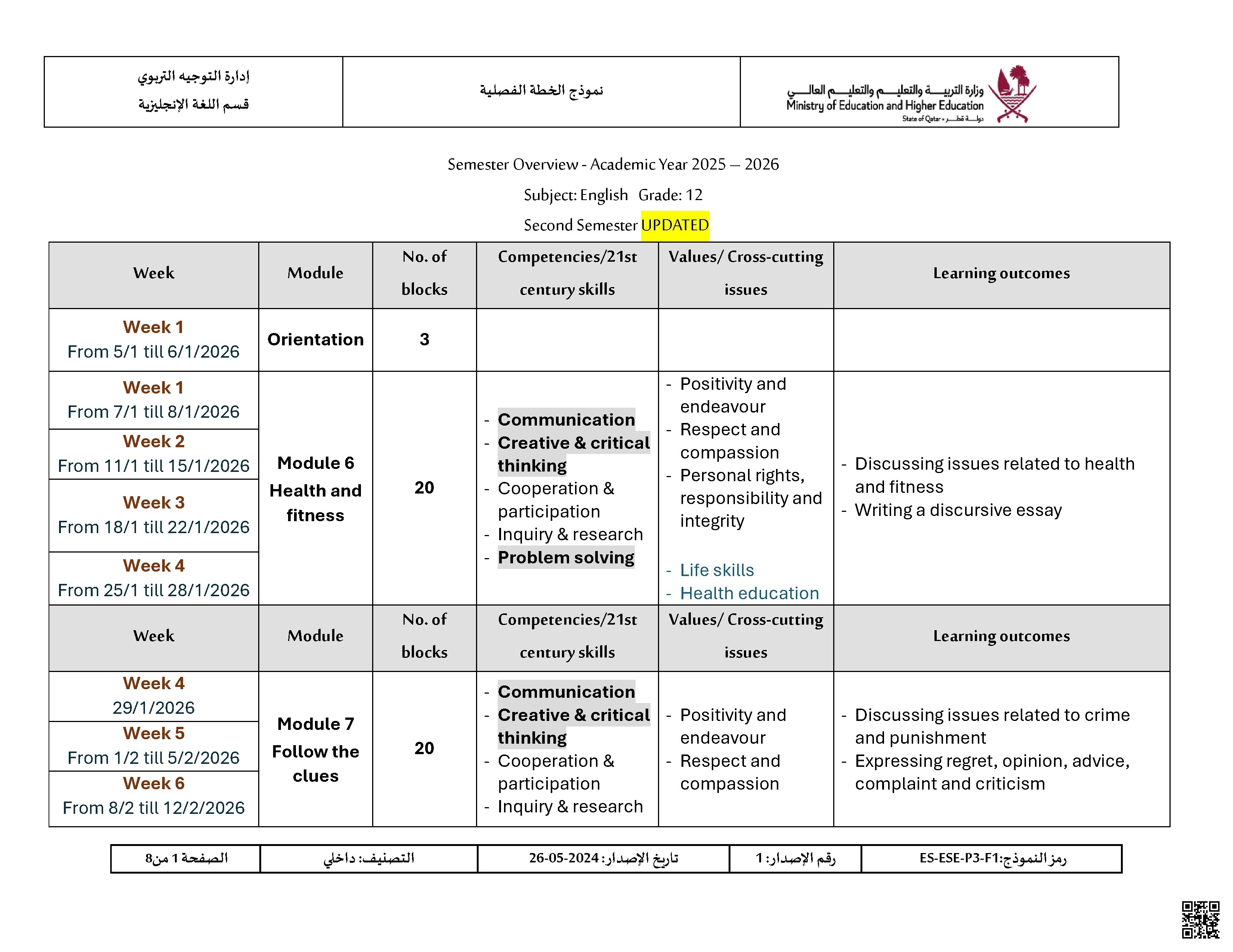 الخطة الفصلية للفصل الثاني