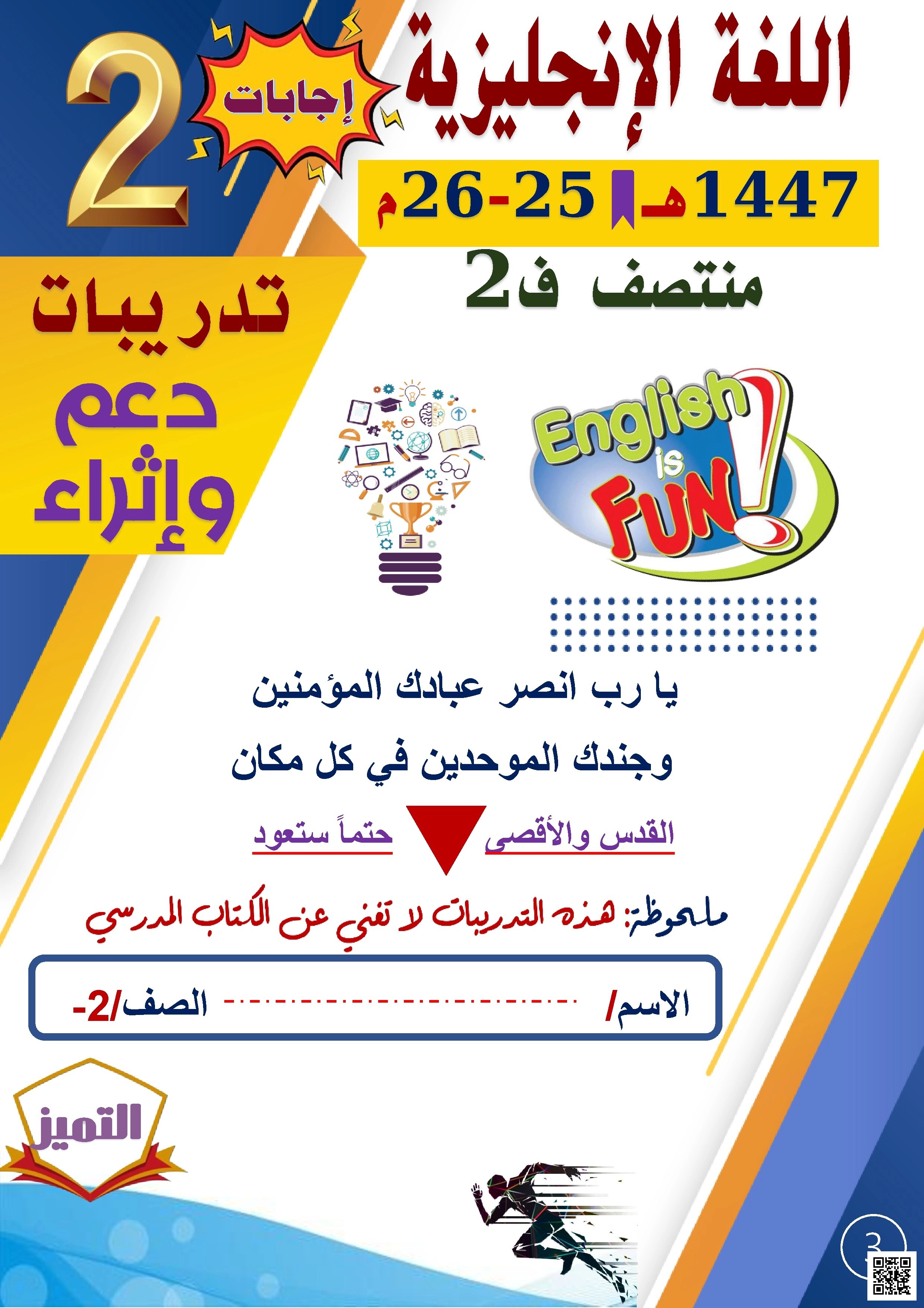 يحتوي الملف على تدريبات دعم وإثراء في مادة اللغة الإنجليزية للصف الثاني المتوسط، ويتضمن قوائم كلمات مترجمة مع معانيها بالعربية.