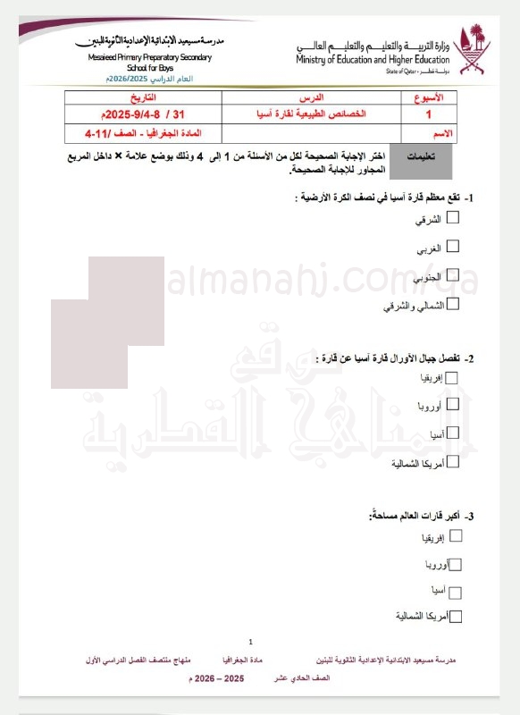 أوراق عمل درس قارة آسيا غير مجابة - إعداد: مدرسة مسيعيد | ||