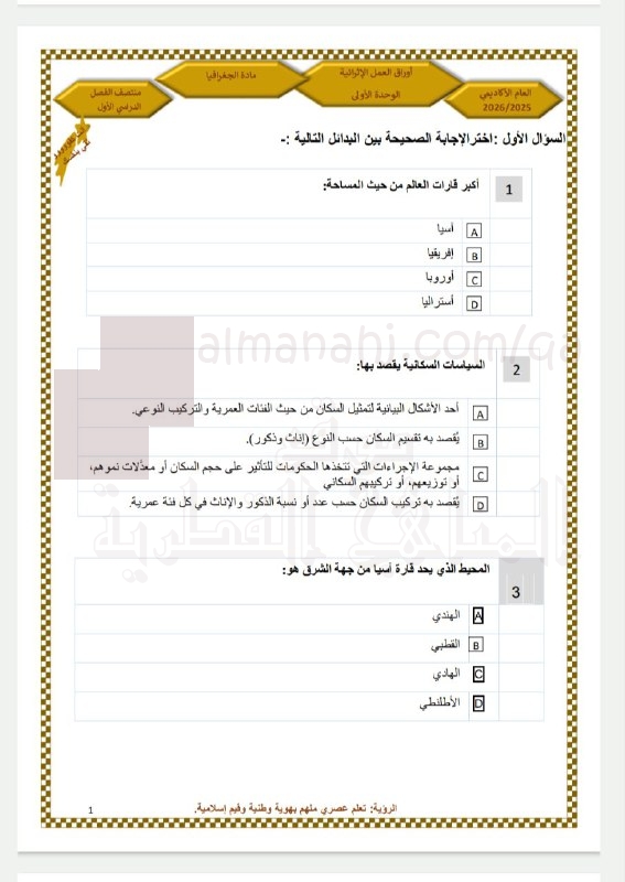 تم إيجاد الملف: الأوراق الإثرائية لاختبار منتصف الفصل للوحدة الأولى (قارة آسيا) غير مجابة