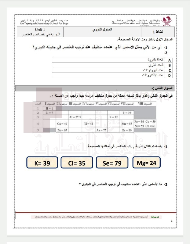 كراسة أنشطة الوحدة الأولى الدورية في خصائص العناصر غير مجابة - إعداد: مدرسة ابن تيمية | ||