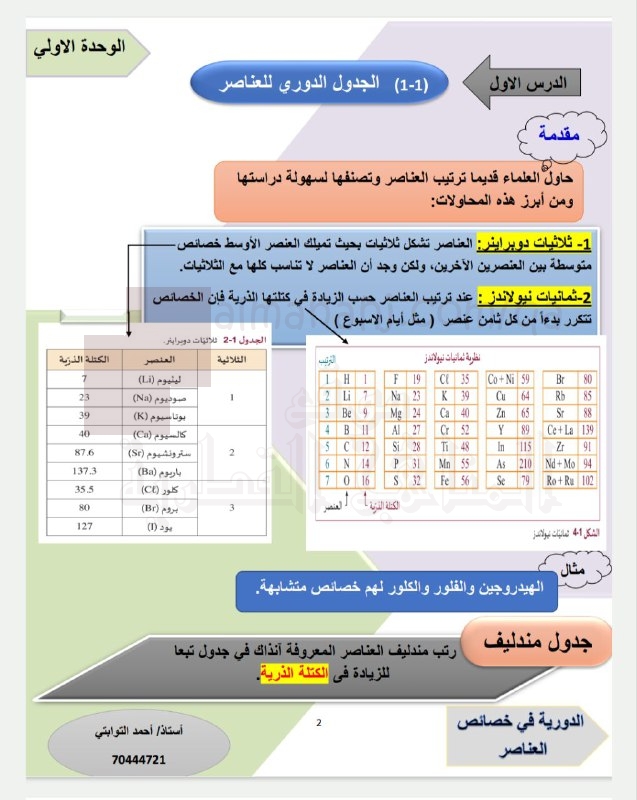 شرح وملخص دروس الوحدة الأولى الدورية في خصائص العناصر - إعداد: أحمد التوابتي | ||