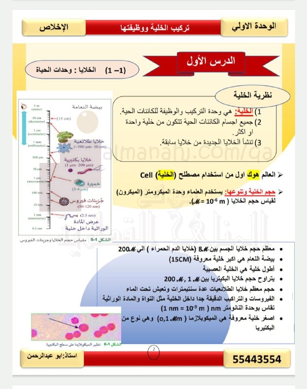 مذكرة الإخلاص الوحدة الأولى تركيب الخلية ووظيفتها لاختبار منتصف الفصل - إعداد: أبو عبد الرحمن | ||