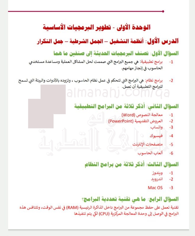 إجابات أوراق عمل إثرائية منتصف الفصل الوحدة الأولى تطوير البرمجيات الأساسية | ||