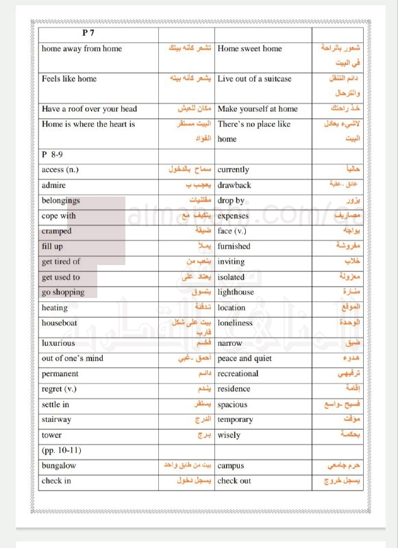 تم إيجاد الملف: مفردات القسم الأول Feels like home مع الترجمة للعربية
