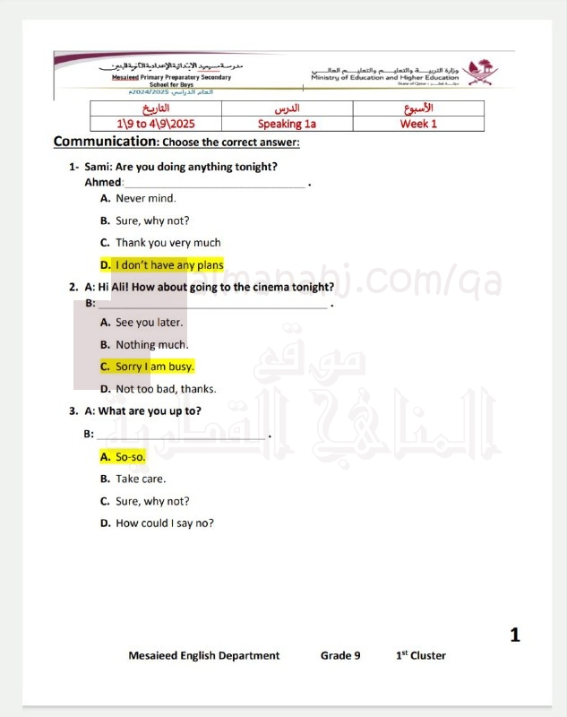 أنت هنا: موقع المناهج ⇦ المناهج القطرية ⇦ المستوى التاسع ⇦ لغة انجليزية ⇦ الفصل الأول ⇦ أوراق عمل |