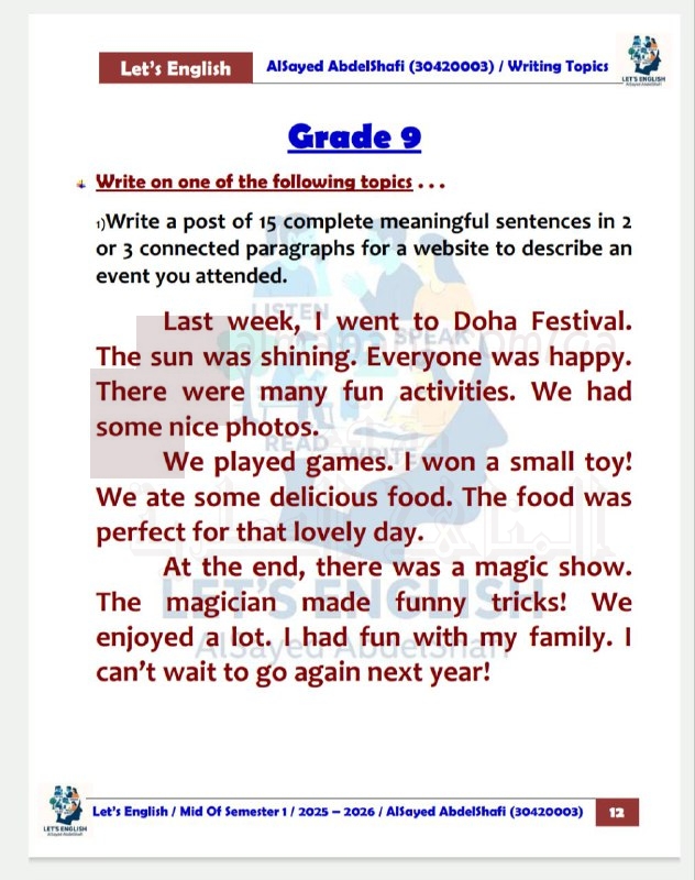 نموذج إجابة أوراق عمل مواضيع Writing منتصف الفصل - إعداد: السيد عبدالشافي | ||
