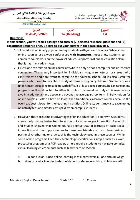 أهلاً بكم جميعاً طلاباً ومدرسين وأهالي طلبة ومهتمين، في قسم دولة قطر ، نحن الآن في الفصل الأول من العام الدراسي 2025/2026 وتاريخ اليوم 2025/10/21 م | |
