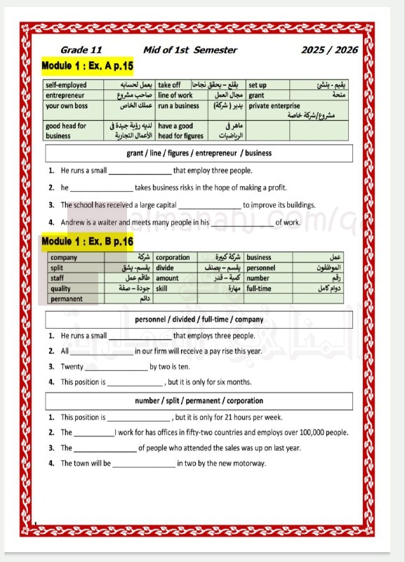 | تدريبات إثرائية لاختبار منتصف الفصل من مدرسة الفرقان | ||