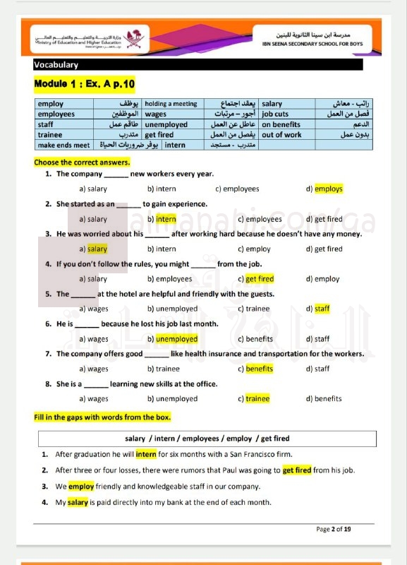معلومات الملف: نموذج إجابة مكتسبات التعلم للوحدتين الأولى و الثانية من مدرسة ابن سينا