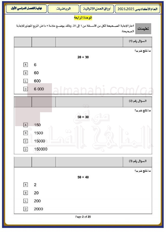 معلومات الملف: يحتوي الملف على تدريبات دعم وإثراء لمادة الرياضيات للصف الرابع الابتدائي لنهاية الفصل الدراسي الأول، تغطي وحدتي الضرب في عدد من رقمين والقسمة على عدد من رقم واحد. وتضم الأوراق مسائل حسابية ولفظية متنوعة تشمل التقدير، واستخدام نماذج المساحة وخاصية التوزيع، والقسمة المطولة مع وجود باقٍ. | |||