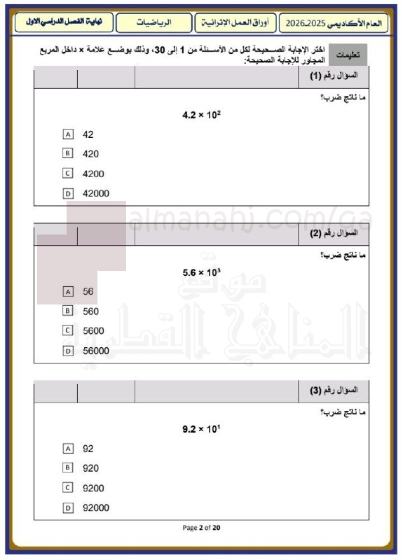 معلومات الملف: يتضمن الملف مجموعة من أوراق عمل وتمارين لمادة الرياضيات للصف الخامس في قطر للعام الدراسي 2025/2026م. تركز الأوراق على عمليات ضرب وقسمة الكسور العشرية والأعداد الكلية ومضاعفات العدد | |||