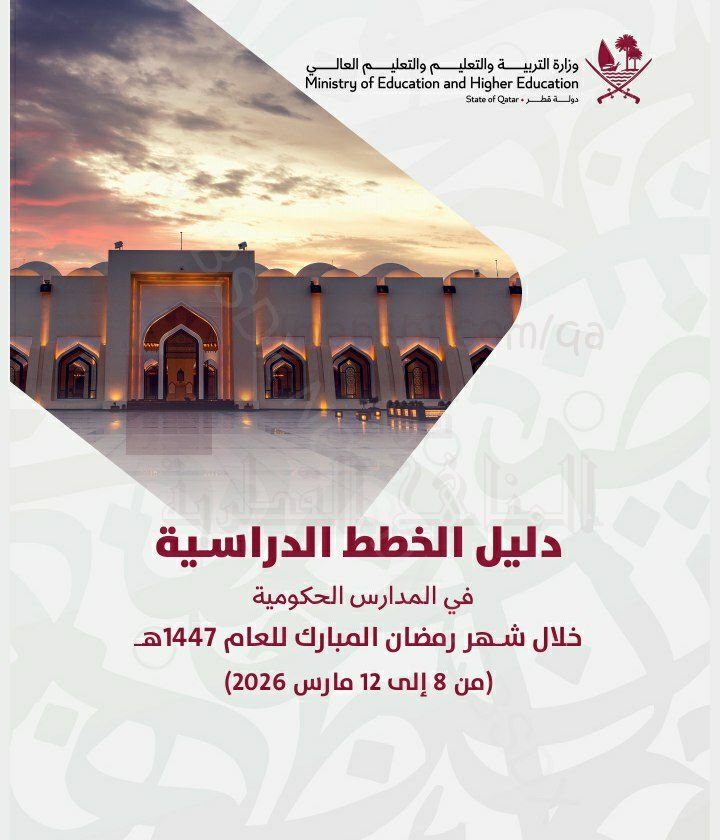 | يحتوي الملف على تعميم رسمي من قطاع الشؤون التعليمية بوزارة التربية والتعليم والتعليم العالي في قطر، بالإضافة إلى دليل تفصيلي للخطط الدراسية خلال الفترة من 8 إلى 12 مارس 2026، والتي تتزامن مع شهر رمضان المبارك للعام الأكاديمي 2025-2026. أولاً: أبرز نقاط التعميم · جهة الإصدار: قطاع الشؤون التعليمية. ثانياً: ملخص دليل الخطط الدراسية يقدم الدليل التوزيع الزمني للحصص اليومية والخطط الدراسية (عدد الحصص لكل مادة) لمختلف المراحل والمدارس، وذلك على النحو التالي: 1. التوزيع الزمني للحصص (لكل المراحل): · المرحلة الابتدائية: 4 حصص مدة كل حصة 35 دقيقة، تبدأ من 10:00 صباحًا. 2. الخطط الدراسية (عدد الحصص الأسبوعي): · المرحلة الابتدائية: | ||