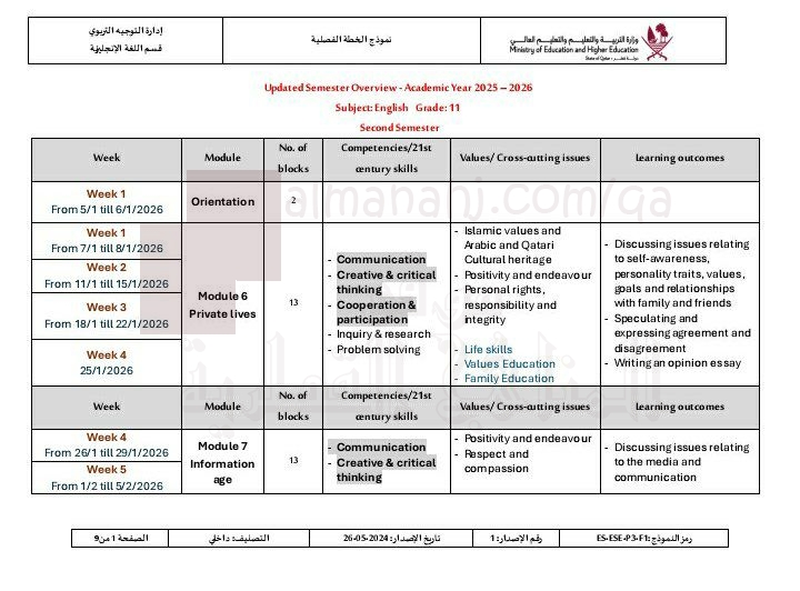 يتم الآن تحضير الملف (الخطة الفصلية المعدلة للفصل الثاني) من أجل التحميل