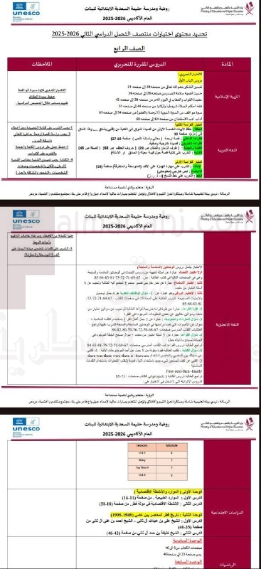 معلومات الملف: يحدد هذا الملف المحتوى الدراسي المقرر للصف الرابع في المواد الأساسية للفصل الدراسي الثاني من العام الأكاديمي 2026/2025، يغطي المحتوى: · الدراسات الاجتماعية: الوحدة الأولى (الموارد والأنشطة الاقتصادية: الموارد الطبيعية، الأنشطة الاقتصادية في قطر) والوحدة الثانية (تاريخ قطر المعاصر 1949-1995). | ||