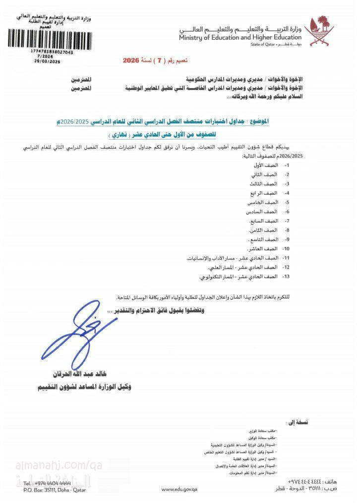 | يتضمن هذا الملف تعميماً رسمياً صادراً عن وزارة التربية والتعليم والتعليم العالي في دولة قطر بشأن جداول اختبارات منتصف الفصل الدراسي الثاني للعام الأكاديمي 2026/2025. | ||