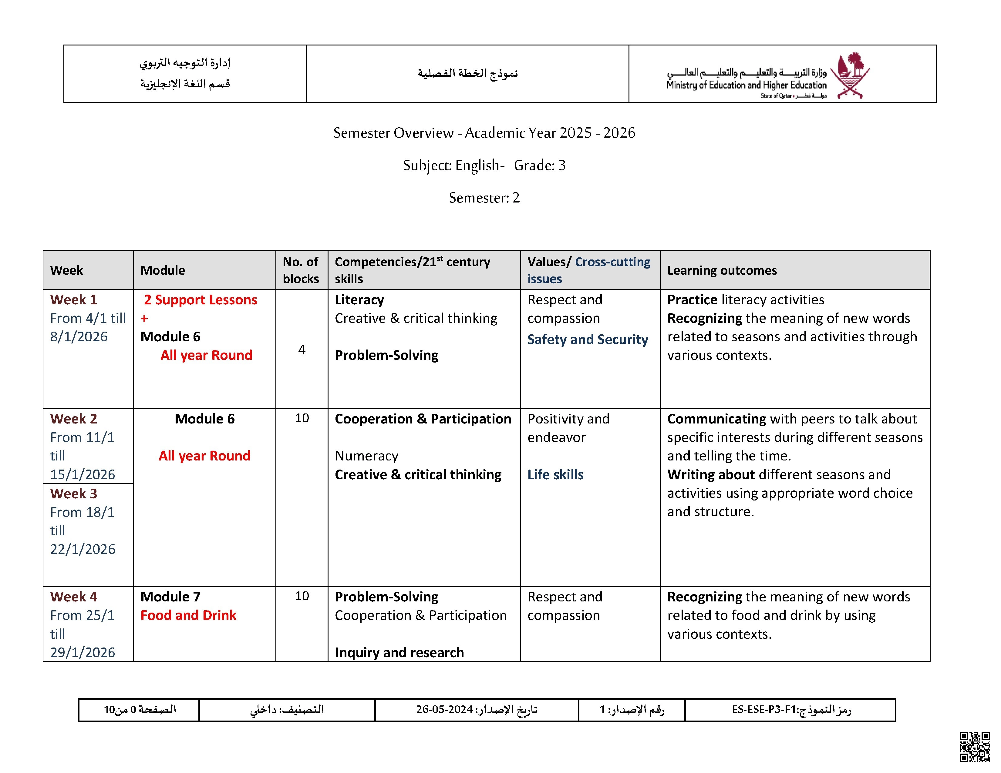 الخطة الفصلية المعدلة للفصل الثاني اخر تحديث 9 أبريل بحسب الصف الثالث في مادة اللغة الإنجليزية – الفصل الثاني