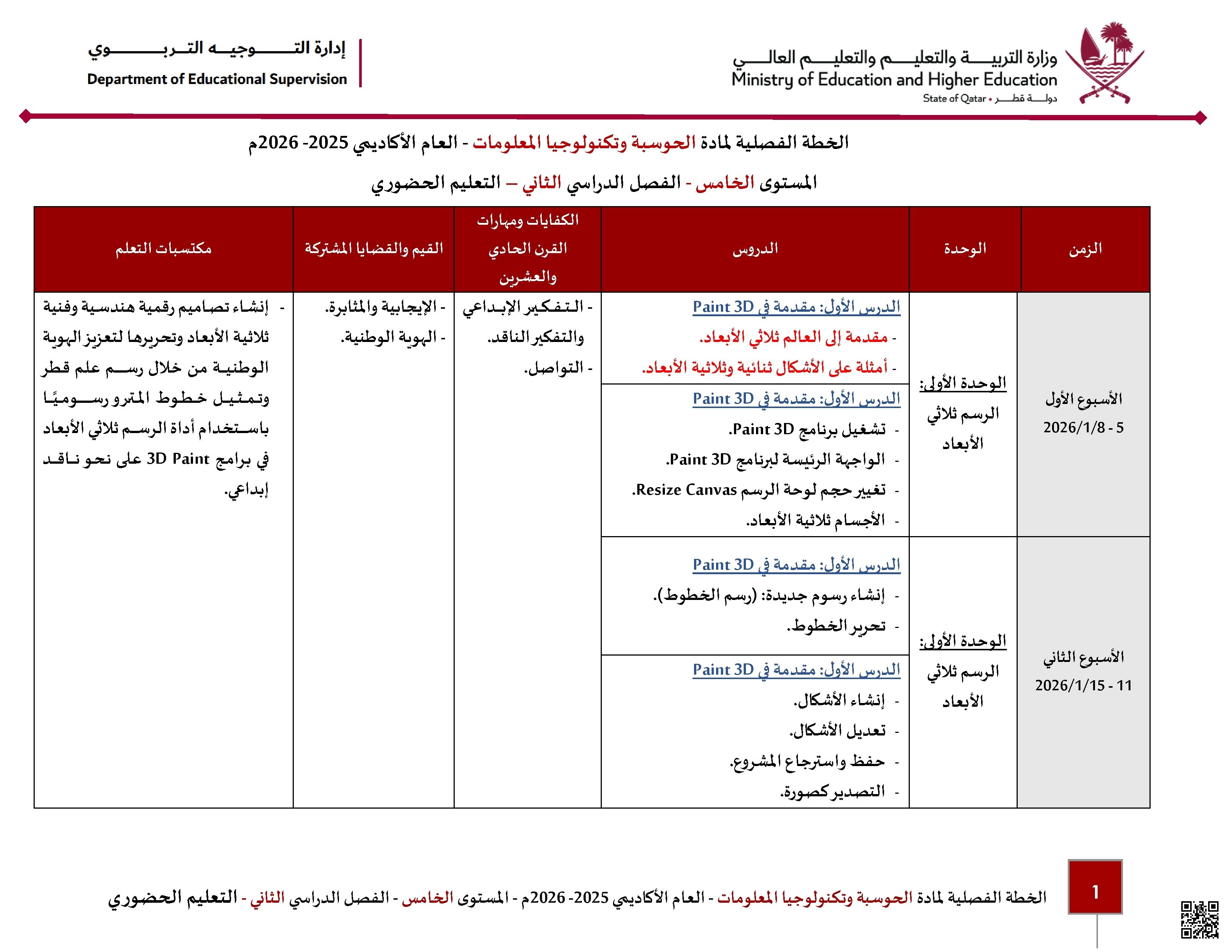 يحتوي الملف على الخطة الفصلية المعدلة الفصل الدراسي الثاني من العام الأكاديمي ٢٠٢٥-٢٠٢٦م