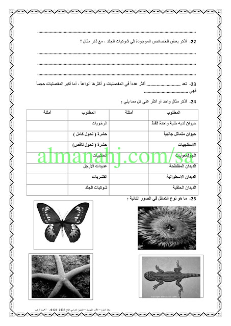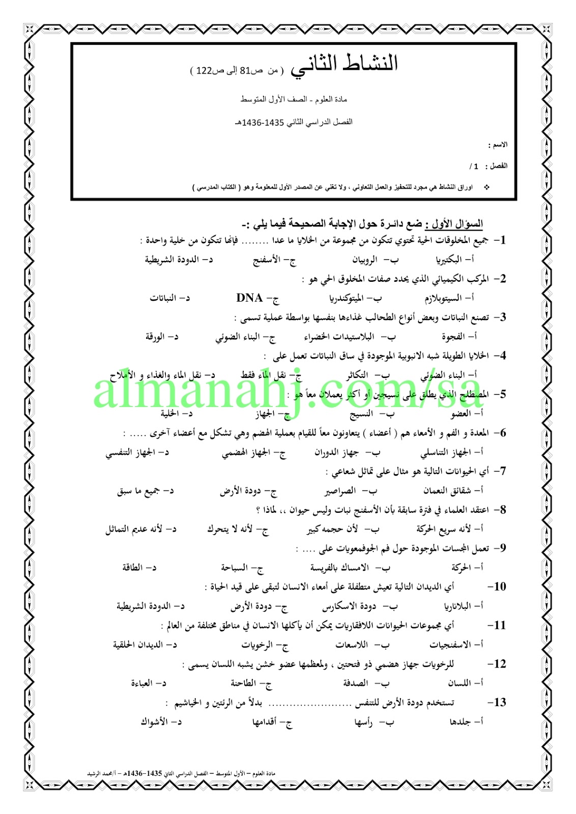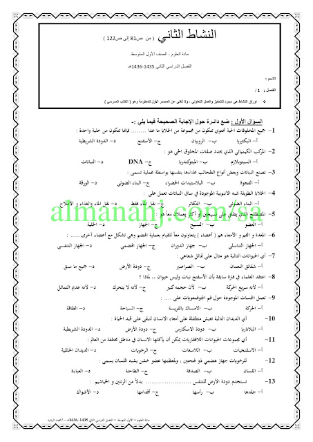 بنك الأسئلة لمادة العلوم /النشاط الثاني /للصف الأول متوسط وفق المنهج السعودي