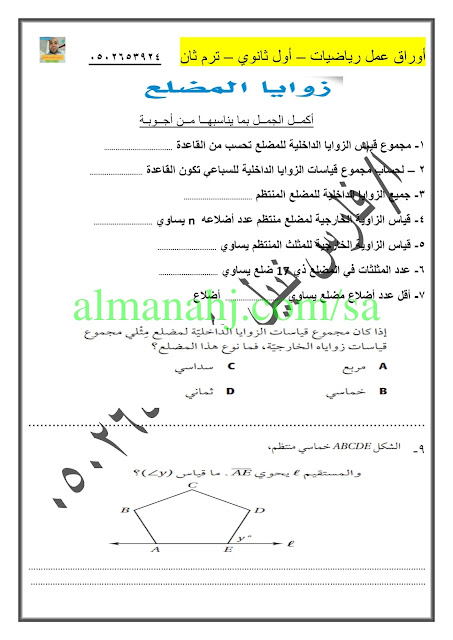 اليكم ملف يتضمن أوراق عمل لمادة الرياضيات للصف الأول الثانوي وفق المنهج السعودي