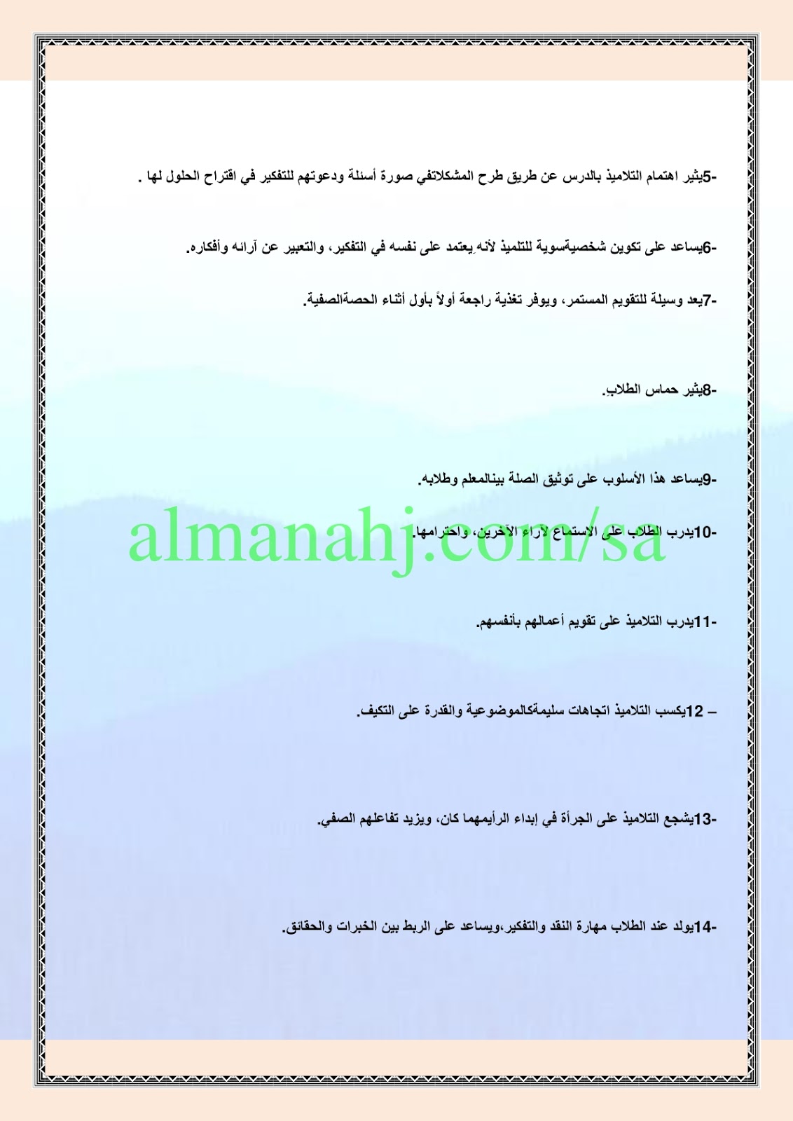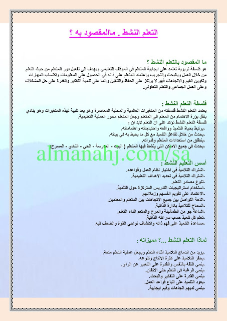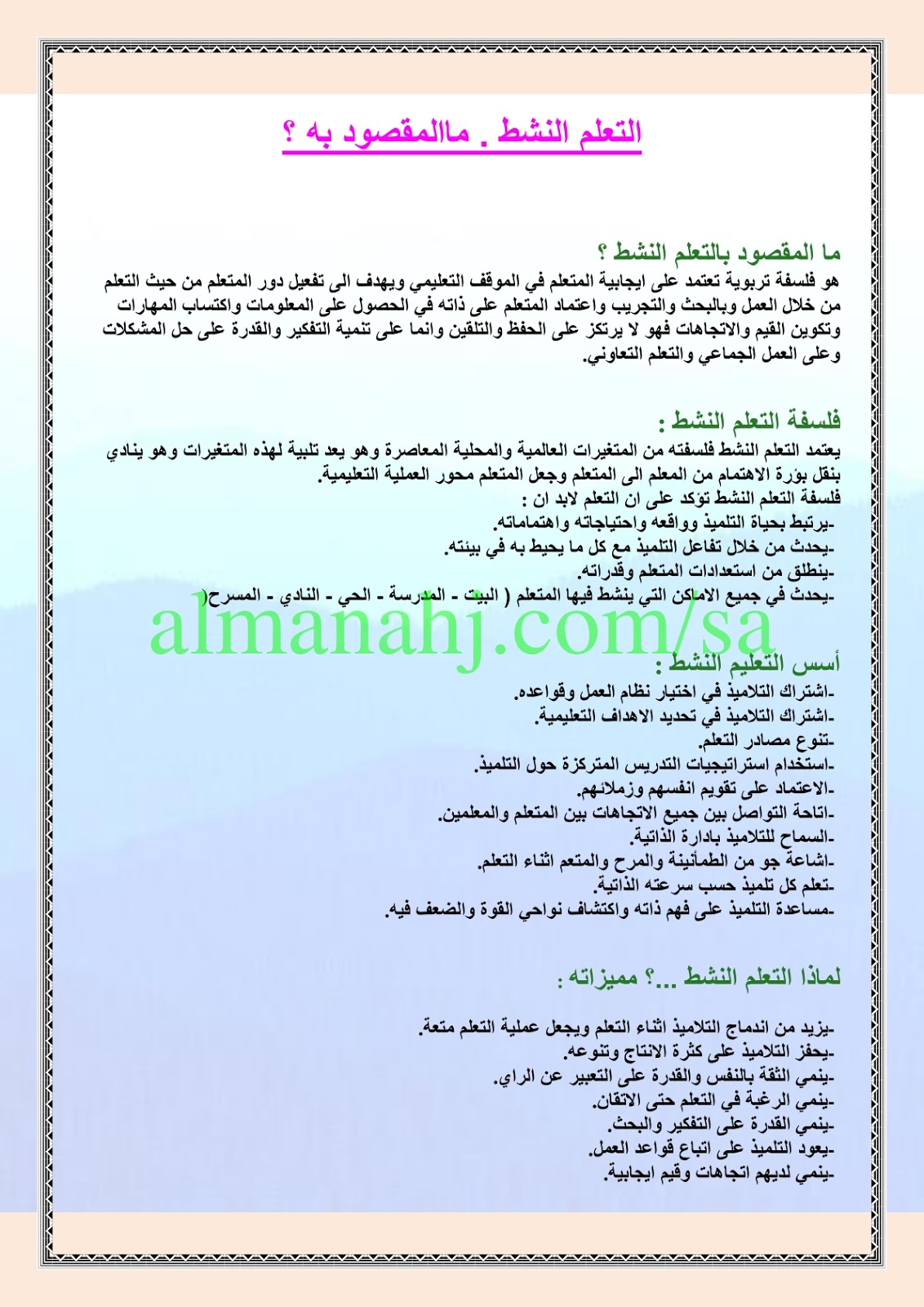 إليكم ملف هام وشامل يتضمن شرح مفصل للتعلم النشط وتوضيح كل ما يتعلق به وتوضيح مفهومه والفرق بينه وبين التعلم التقليدي وتوضيح استراتياجياته بالشرخ المفصل كاستراتبحية العصف الذهني والحوار وحل المشكلات والاكتشاف والتعلم الذاتي وغيرها من الاستراتيجيات