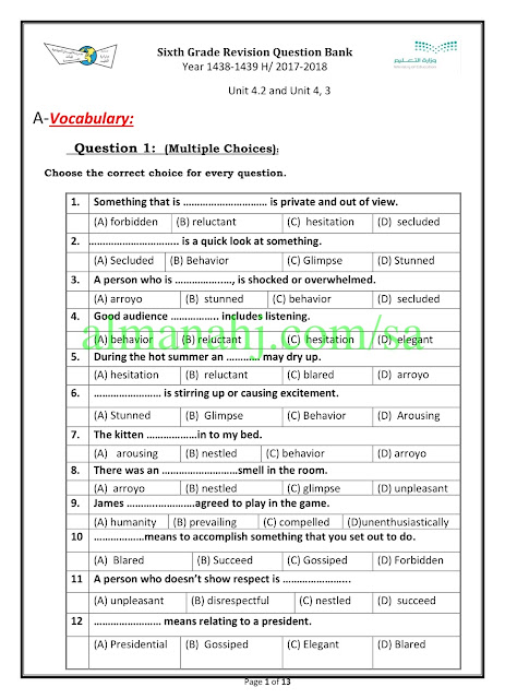 إليكم ملف يتضمن بنك اسئلة و مراجعه لقواعد اللغة الإنجليزية للصف السادس الابتدائي وفق المنهاج السعودي