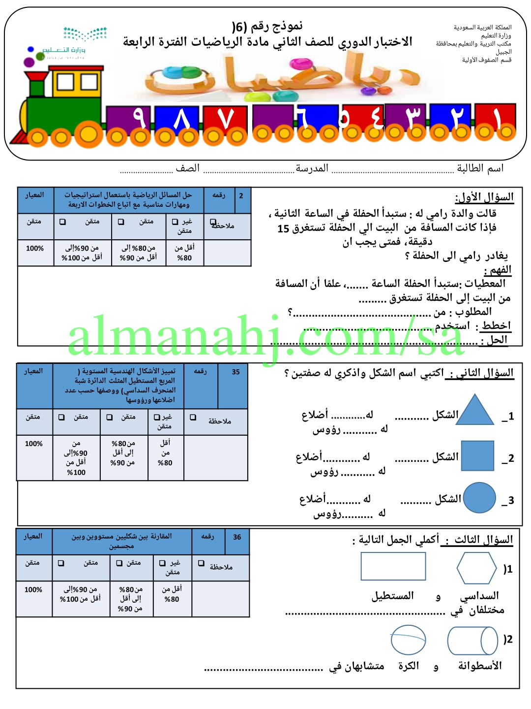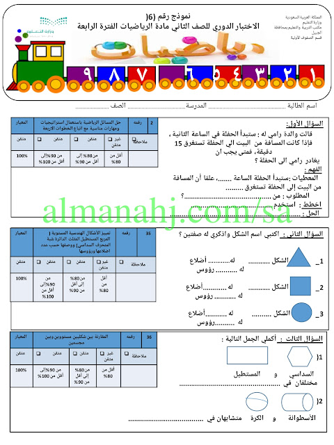 إليكم ملف هام يتضمن النموذج السادس لاختبار الدوري لمادة الرياضيات للصف الثاني الابتدائي الفترة الرابعة وفق المنهج السعودي