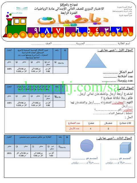 إليكم ملف هام يتضمن النموذج الثاني لاختبار الدوري لمادة الرياضيات للصف الثاني الابتدائي الفترة الرابعة وفق المنهج السعودي