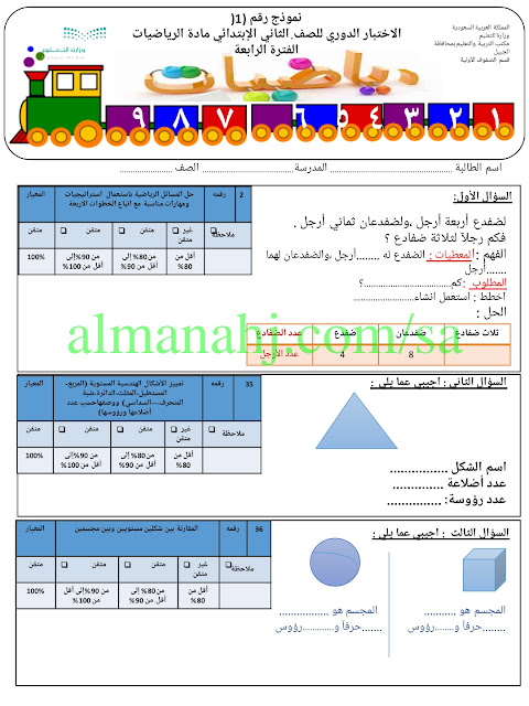 إليكم ملف هام يتضمن النموذج الأول للاختبار الدوري لمادة الرياضيات للصف الثاني الابتدائي الفترة الرابعة وفق المنهج السعودي