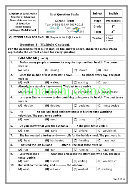 إليكم ملف هام يتضمن بنك اسئلة لمادة اللغة الانجليزية للصف الثاني متوسط وفق المنهج السعودي