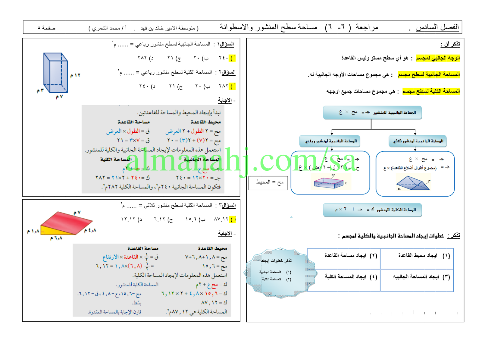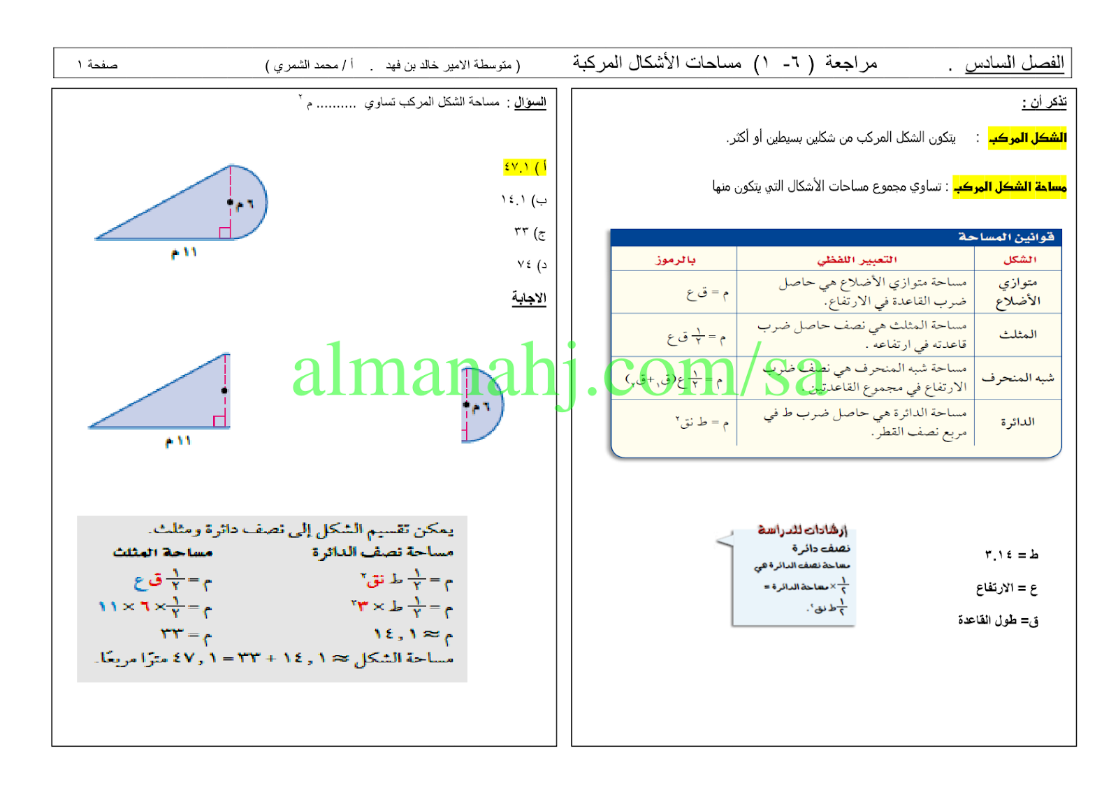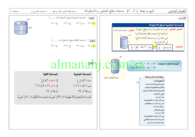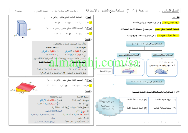 إليكم مراجعة شاملة مع الحلول للفصل السادس (مساحات الأشكال المركبة) من مادة الرياضيات للصف الثاني المتوسط وفق المنهج السعودي