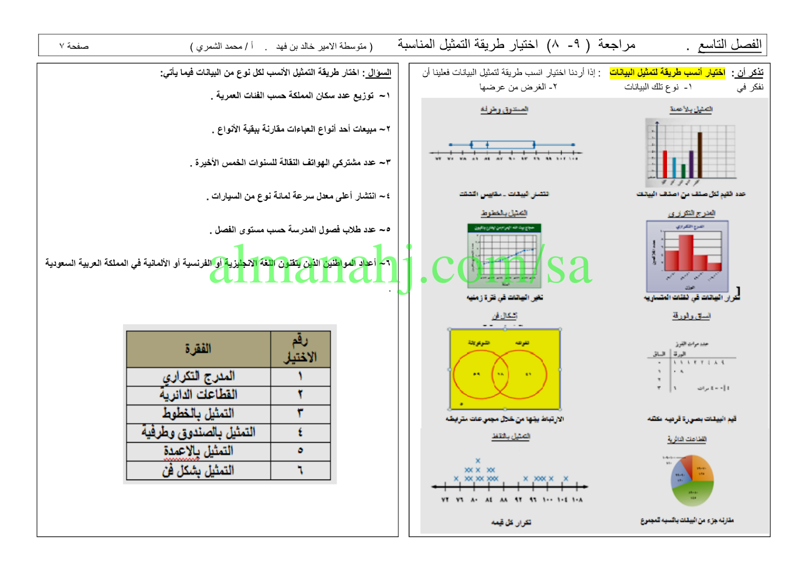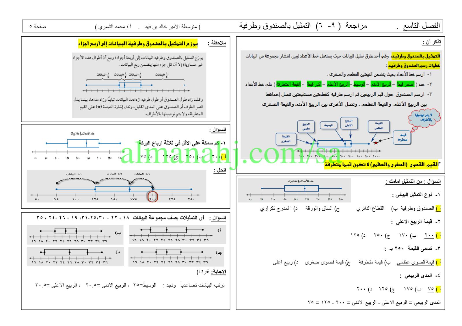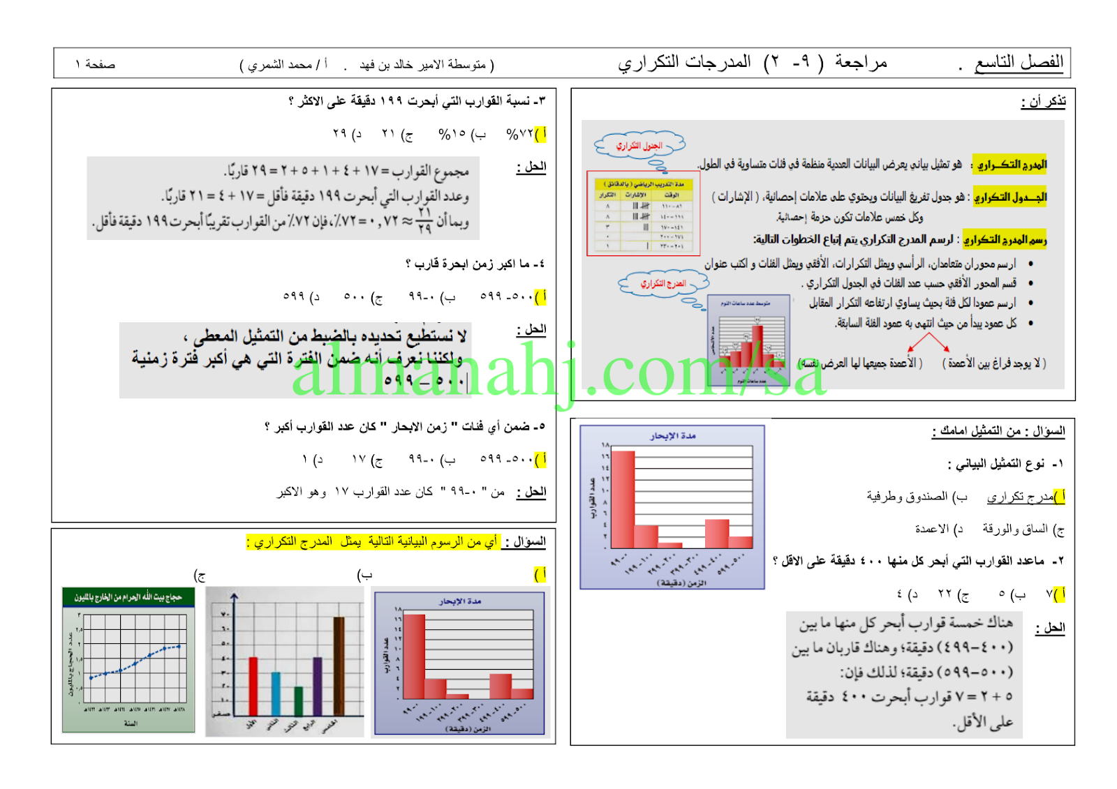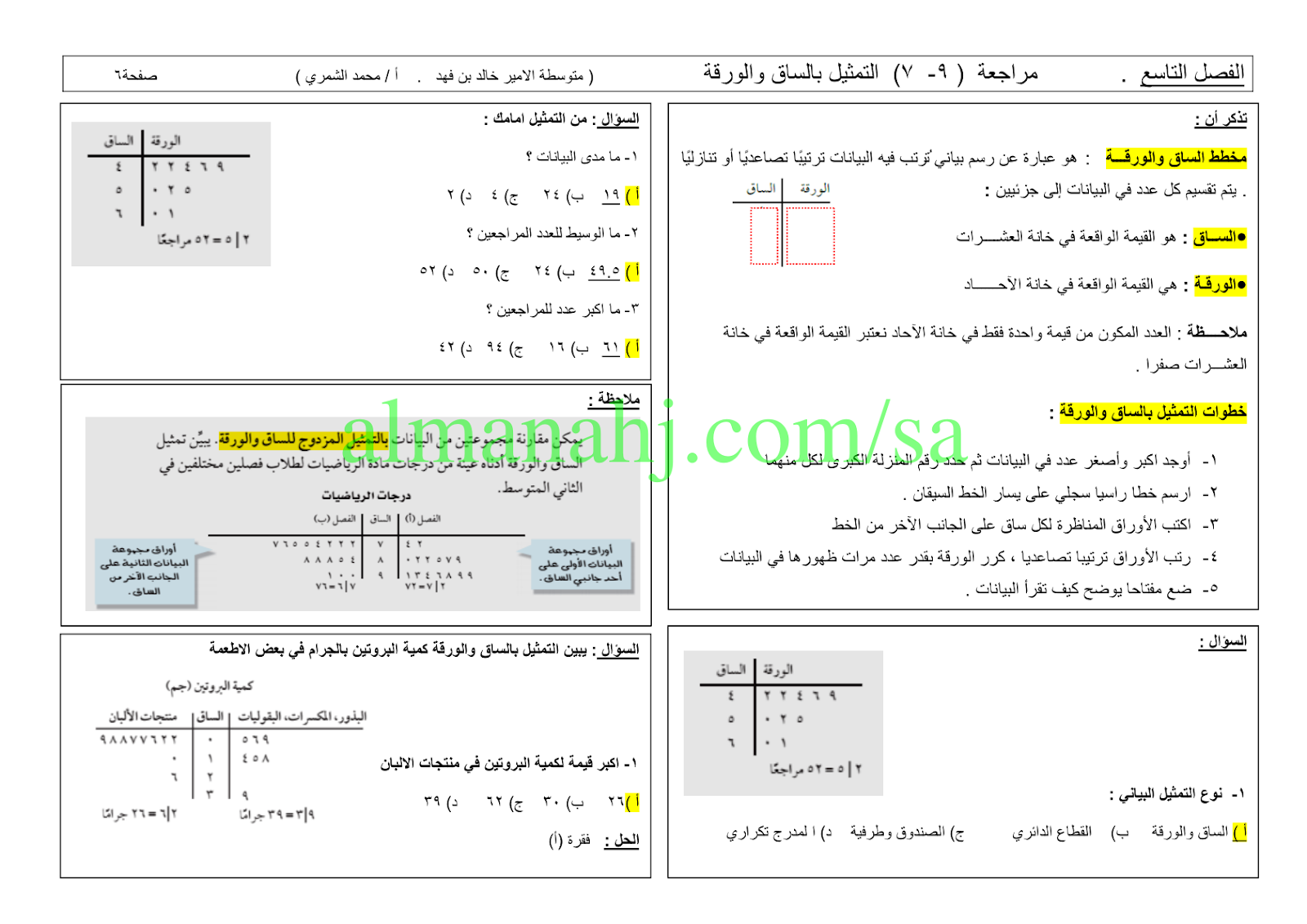 معلومات الملف: إليكم مراجعة شاملة مع الحلول للفصل التاسع (المدرجات التكراري) من مادة الرياضيات للصف الثاني المتوسط وفق المنهج السعودي | ||