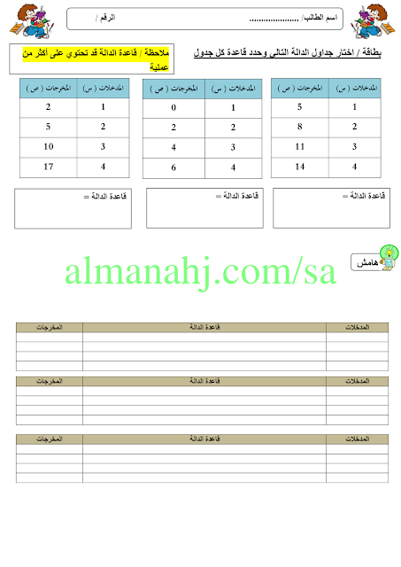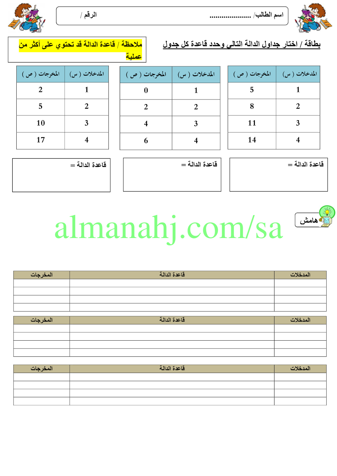 إليكم ملف هام يتضمن ورقة عمل الدالة في مادة الرياضيات للصف الأول متوسط وفق المنهج السعودي